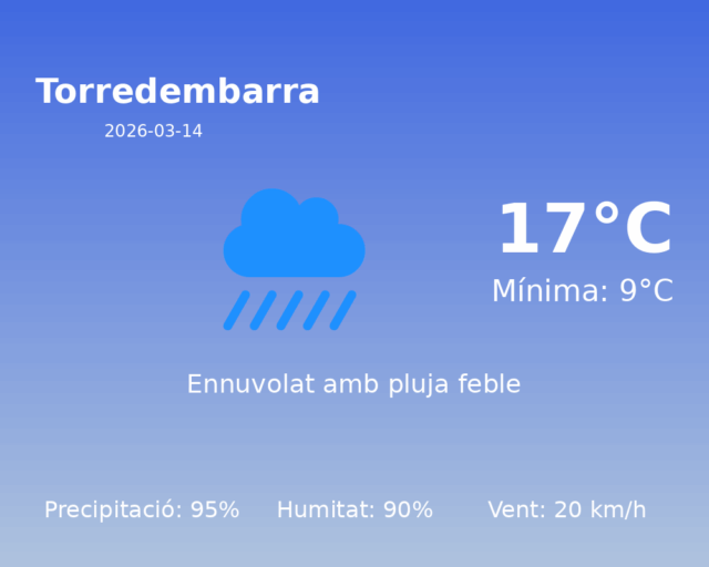 El clima a Torredembarra avui es presentarà especialment plujós, amb un cel cobert predominant durant tota la jornada. Predominaran núvols que es mantindran presents durant gran part del dia. A més, les precipitacions seran força destacades, amb un 95% de probabilitat de pluja, fet que podria afectar activitats a l’aire lliure.