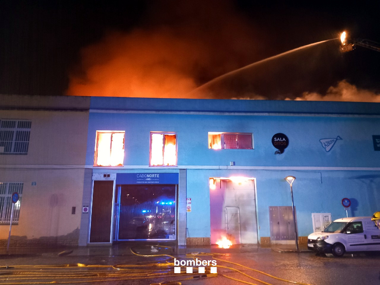ACN Reus – Els Bombers de la Generalitat treballen aquest dissabte al matí en un incendi en una empresa d’aliments congelats a Reus. L’avís del foc s’ha rebut a les 06.17 hores al número 18 del carrer de l’Alcalde Pascual, a l’empresa Cabo Norte. 17 dotacions terrestres dels Bombers s’han desplaçat a la zona i han comprovat que les flames estaven localitzades al fons de la nau industrial -calcinant cambres frigorífiques- i que el sostre del recinte pràcticament s’ha esfondrat. A la part posterior de la fàbrica hi ha diversos habitatges i s’ha demanat preventivament el confinament dels veïns. No consten ferits, però l’incendi provoca una intensa fumarada. Els Bombers miren que el foc no s’estengui a cap nau propera ni als habitatges adjacents.