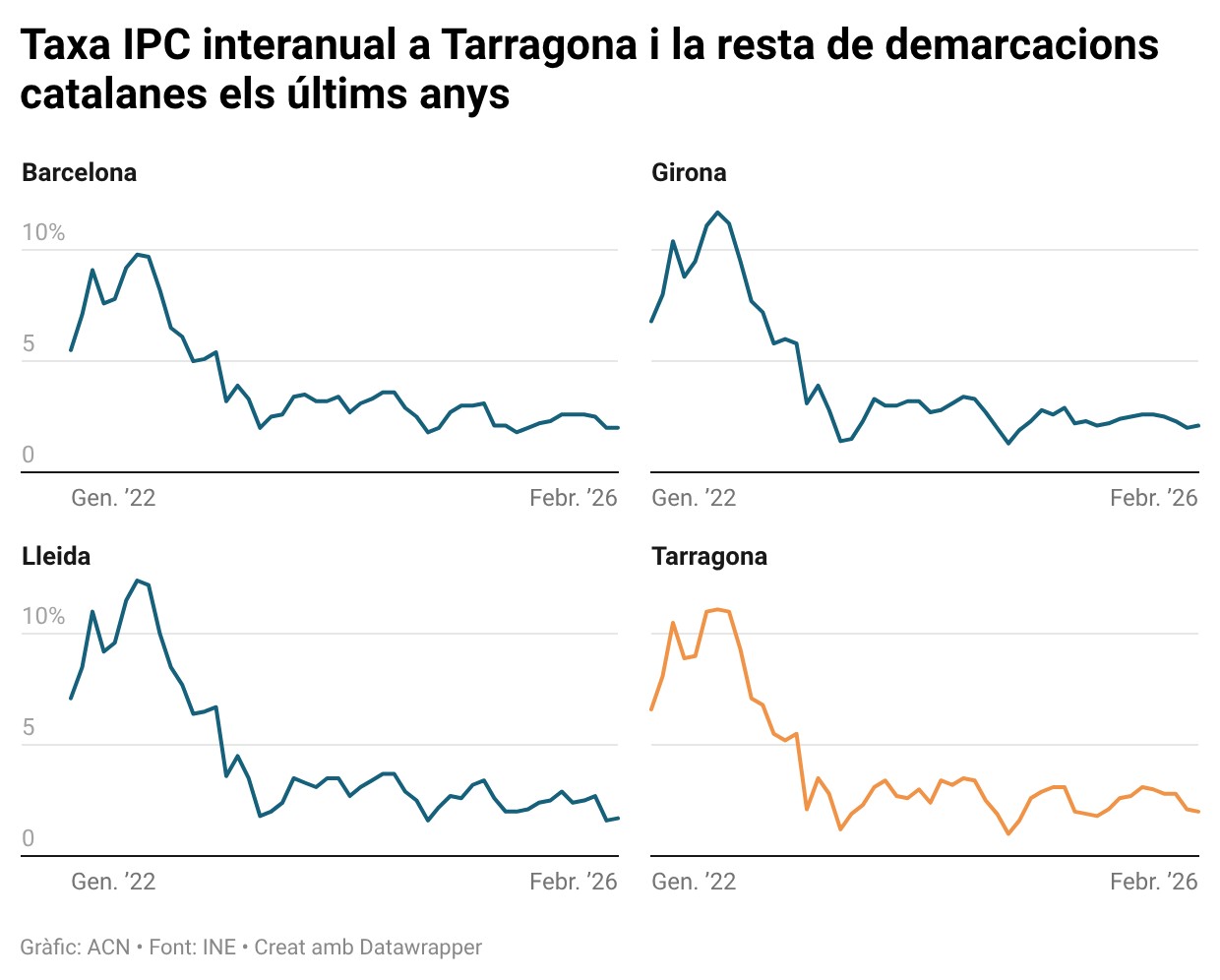 ACN Tarragona – L’Índex de Preus al Consum (IPC) es va situar en el 2% al febrer a la demarcació de Tarragona, segons les dades de l’Institut Nacional d’Estadística (INE). La xifra representa un descens del 0,1% respecte el gener, i s’explica per la baixada de preus de l’electricitat, gas i combustibles (-1,9%), així com el transport (-1,5%). Les dades publicades aquest divendres encara no recullen l’impacte de l’esclat de la guerra a l’Iran, que va començar a principis de març. En canvi, les begudes alcohòliques i el tabac van pujar un 5,2% en comparació amb el mateix mes de l’any passat, mentre que els restaurants i allotjaments ho van fer en un 4,5% i els aliments i begudes no alcohòliques es van encarir un 3,1%.