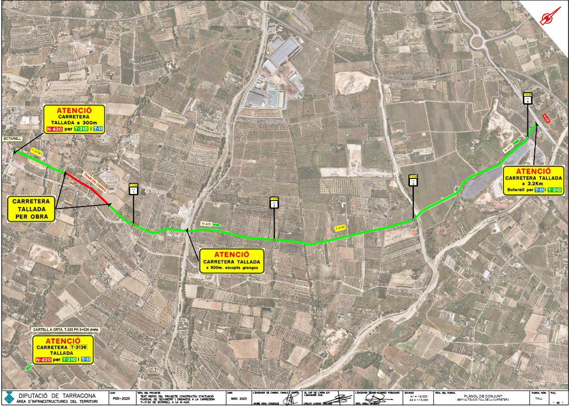 A més, es preveu un tall a la T-3136 de Botarell a la N-420 a partir del 20 d’abril, per permetre millores en la seguretat i en el drenatge de la carretera. Aquesta obra afectarà el trànsit durant més de 5 mesos, i els vehicles hauran de seguir un itinerari alternatiu per la T-11 i la T-310.